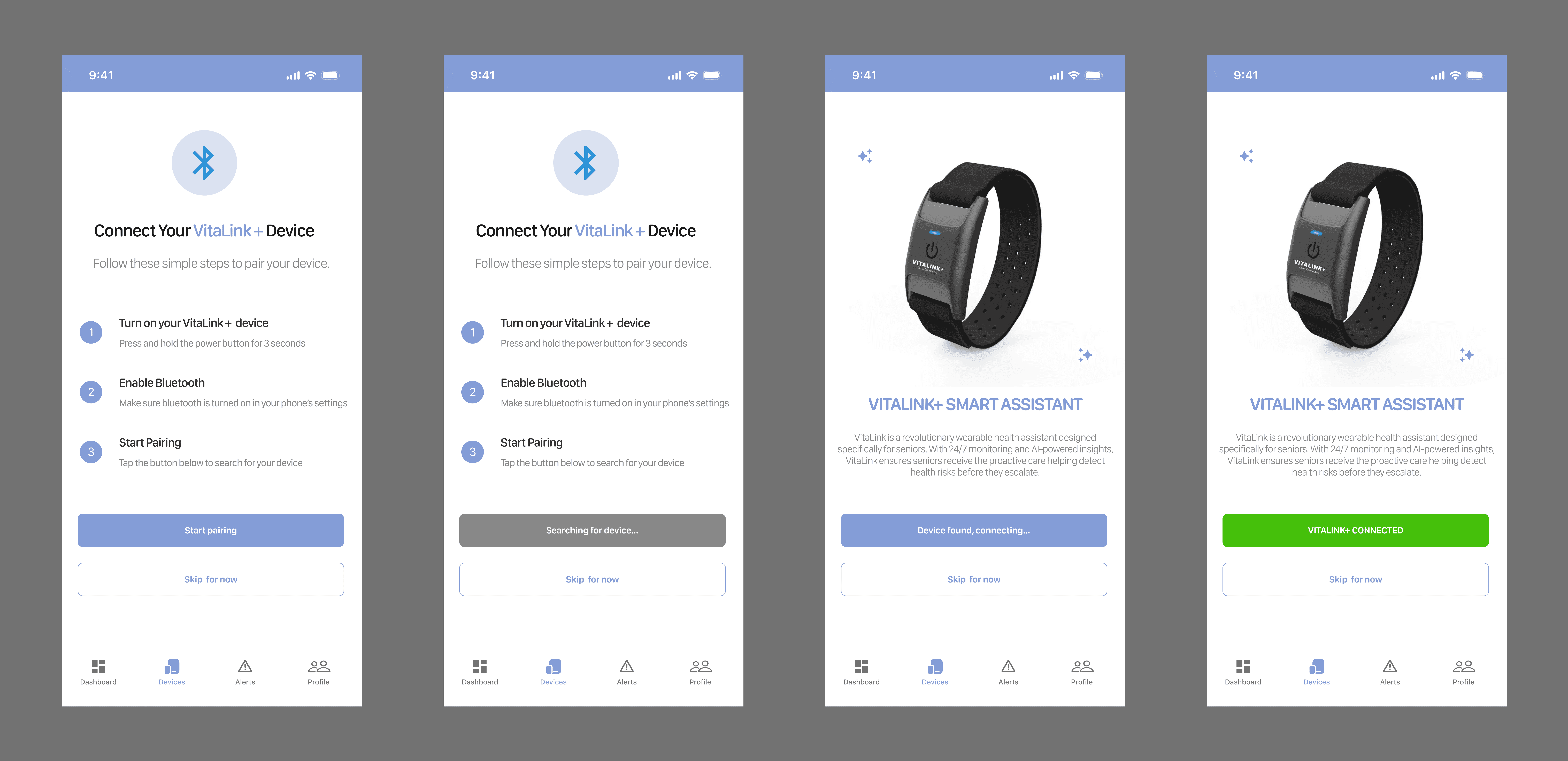 Pair your VitaLink+ device with the mobile app in seconds. Our smart pairing technology makes setup effortless. VitaLink tracks vital signs, behavior, and habits, predicting potential health risks like falls or dehydration before they happen.